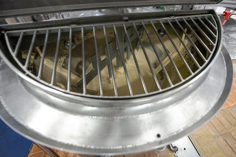 Einen Tag bevor Snøfrisk® produziert wird, liefern einige der 26 Höfe aus der Region ihre Ziegenmilch. Jede Fuhre wird genau auf ihren Gehalt an Proteinen, Laktose sowie Zellstoffen geprüft und die Bakterienkulturen in der Milch werden analysiert. So wird erstens sichergestellt, dass nicht eine schlechte Lieferung die übrige Milch verdirbt, und zweitens, dass der Preis der Milch angemessen ist. Der hängt nämlich von der Qualität ab. Die Milch übernachtet dann in einem großen Tank, wo der pH-Wert kontrolliert wird. Der liegt bei Ziegenmilch knapp unterhalb des neutralen Wertes 7. Um ihn zu senken, werden Bakterienkulturen zugesetzt. Dieses sogenannte Sauerlegen verhindert die Entstehung von Keimen und fördert die Gerinnung.